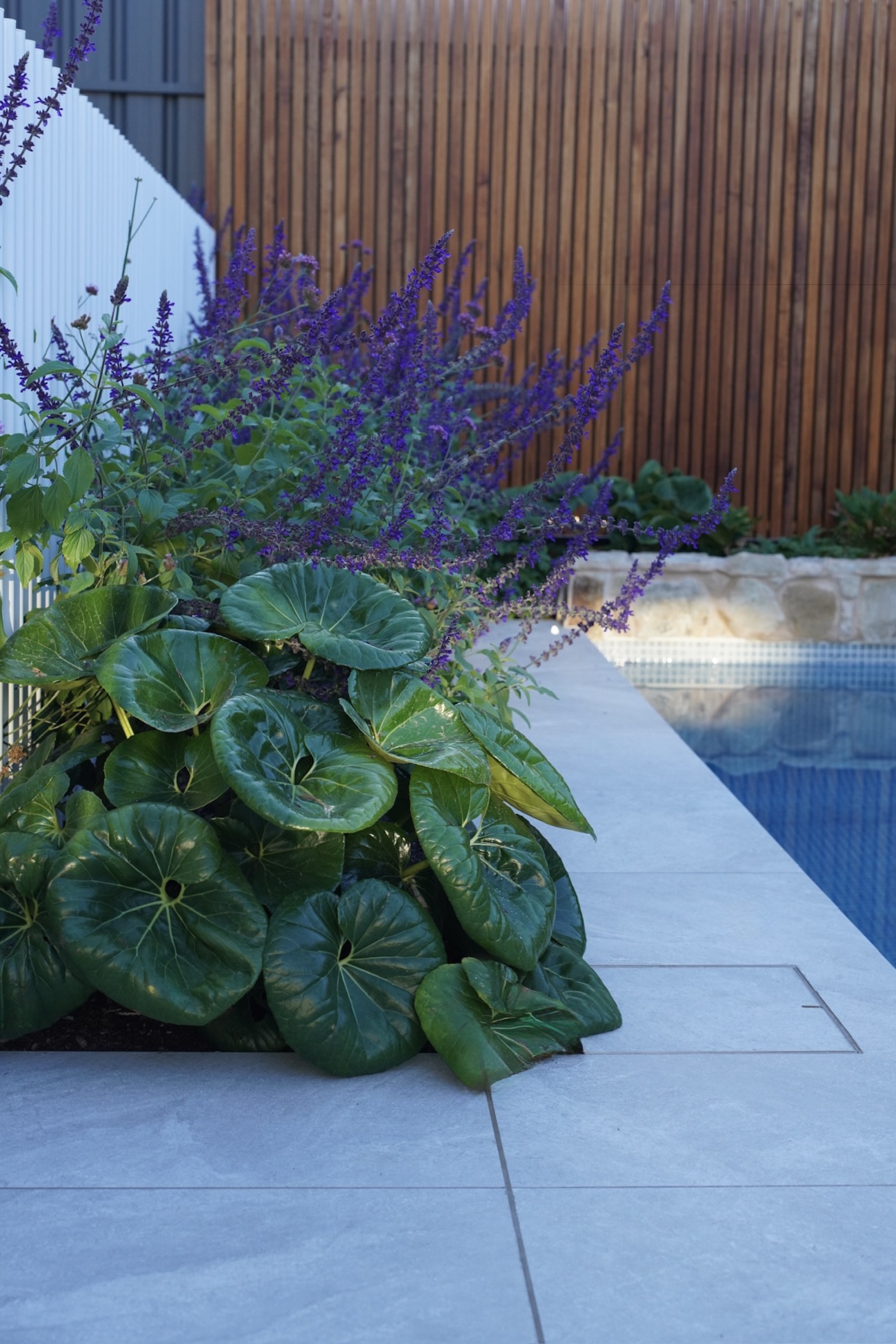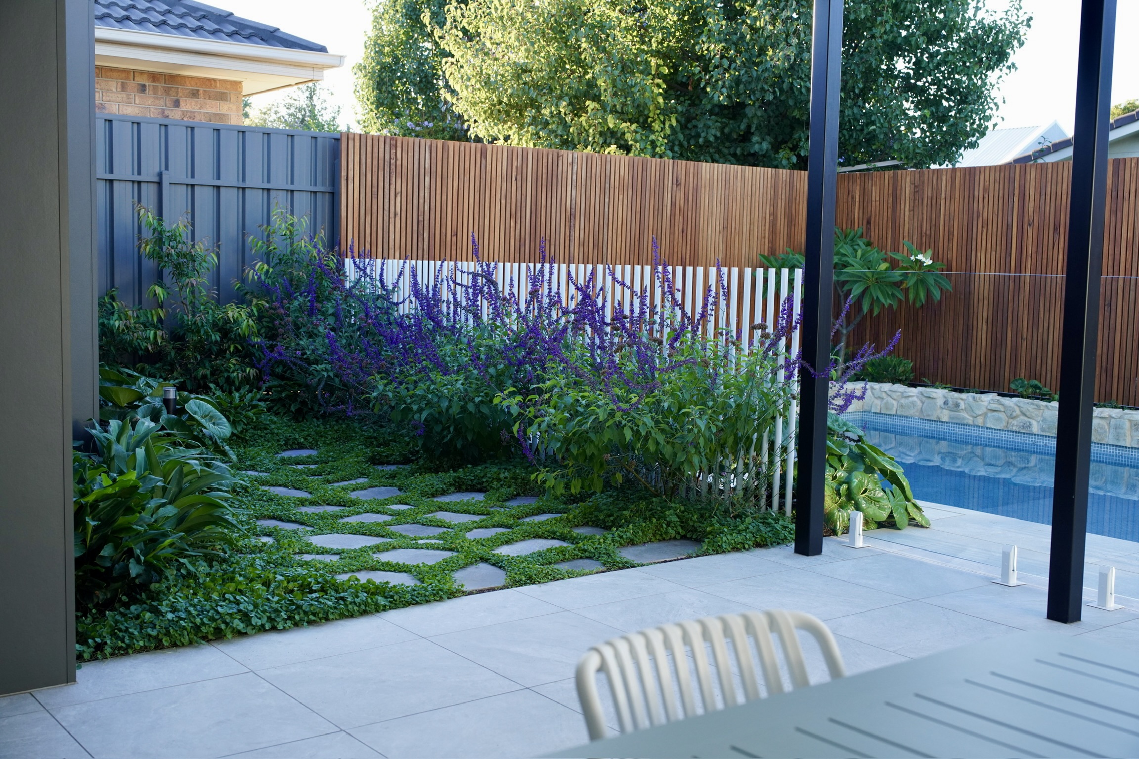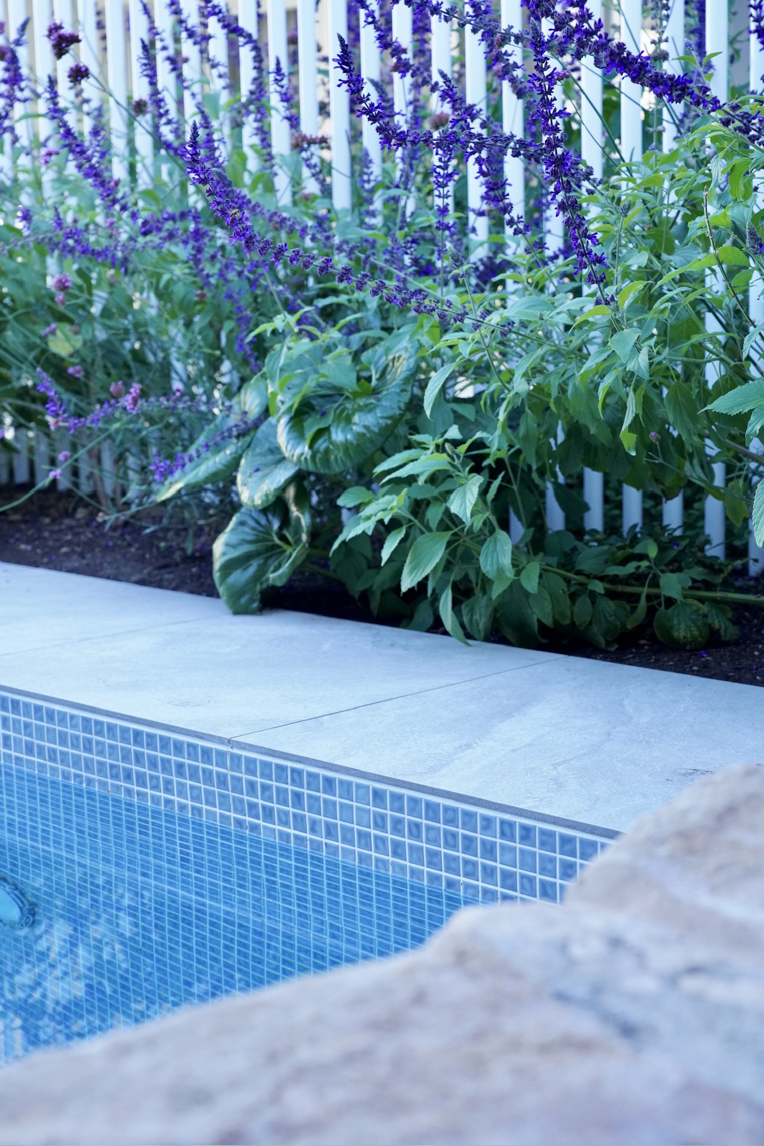 Planting has been layered to soften the built elements and create a sense of immersion. While still establishing, the palette has been selected to provide movement, texture and seasonal interest, and will, over time, settle into a lush, cohesive garden. To the rear of the pool, a more intimate garden moment unfolds. A custom pool equipment shed has been integrated into the design, with its rear edge softened by planting and a series of sage limestone steppers set within groundcover. This space is intentionally more interactive—an area to move through, pause within, or occupy with a single chair – where purple flowering perennials spill gently through pik fencing, blurring the boundary between structure and planting.