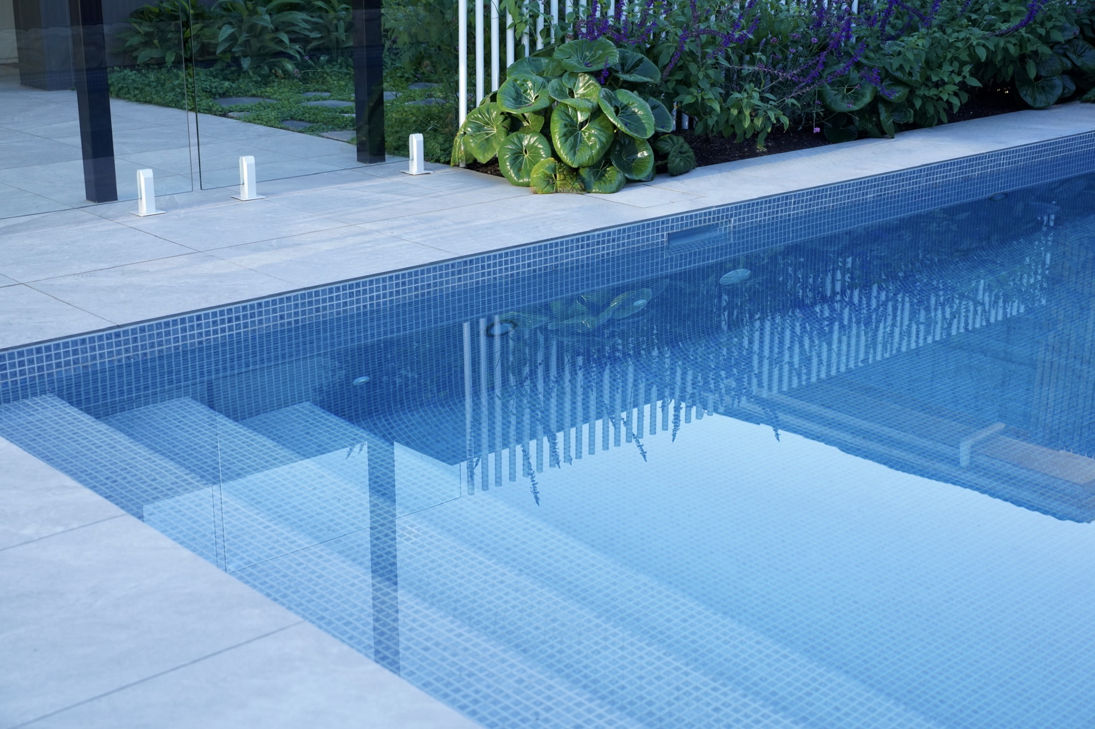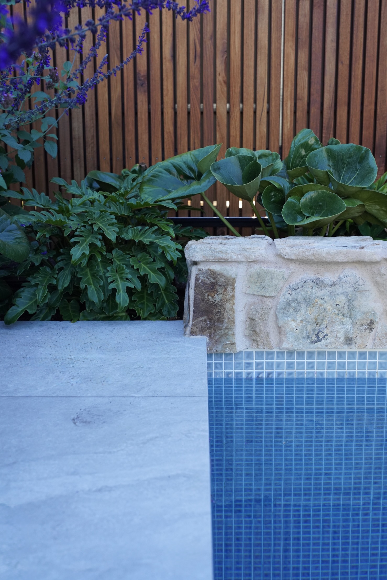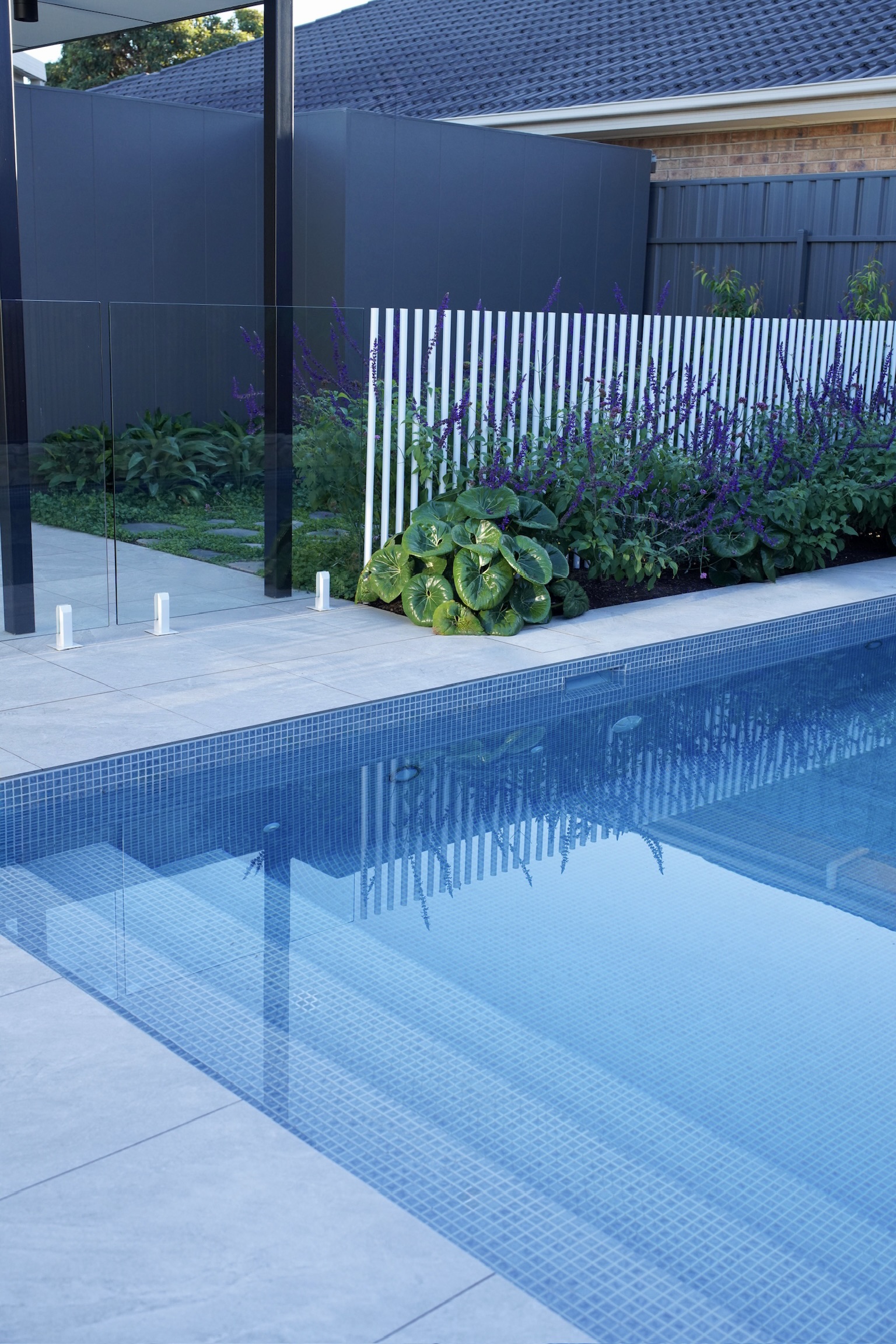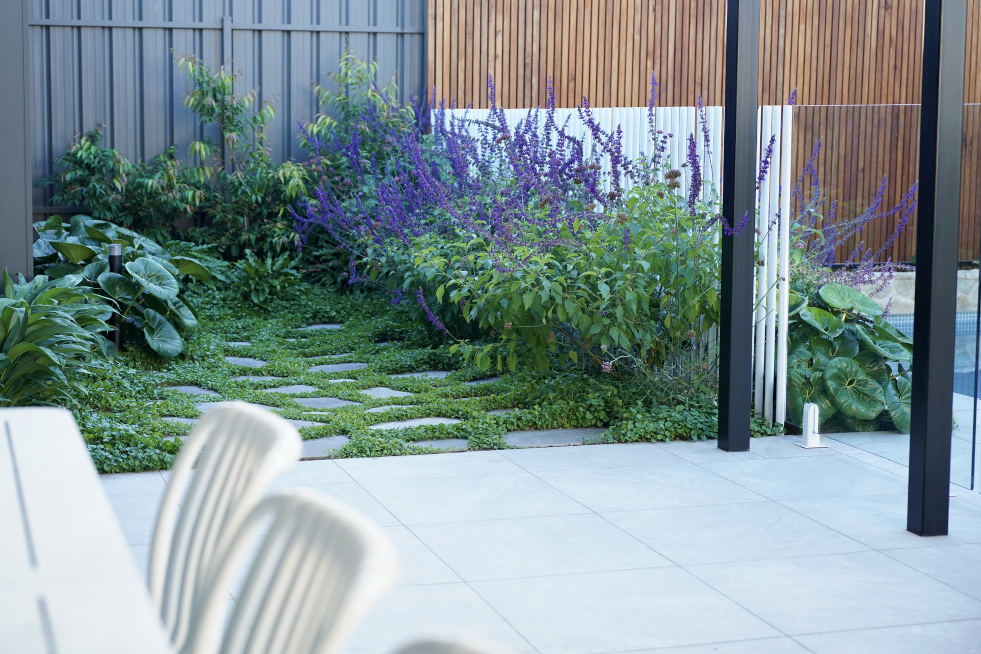 Planting has been layered to soften the built elements and create a sense of immersion. While still establishing, the palette has been selected to provide movement, texture and seasonal interest, and will, over time, settle into a lush, cohesive garden. To the rear of the pool, a more intimate garden moment unfolds. A custom pool equipment shed has been integrated into the design, with its rear edge softened by planting and a series of sage limestone steppers set within groundcover. This space is intentionally more interactive—an area to move through, pause within, or occupy with a single chair – where purple flowering perennials spill gently through pik fencing, blurring the boundary between structure and planting.