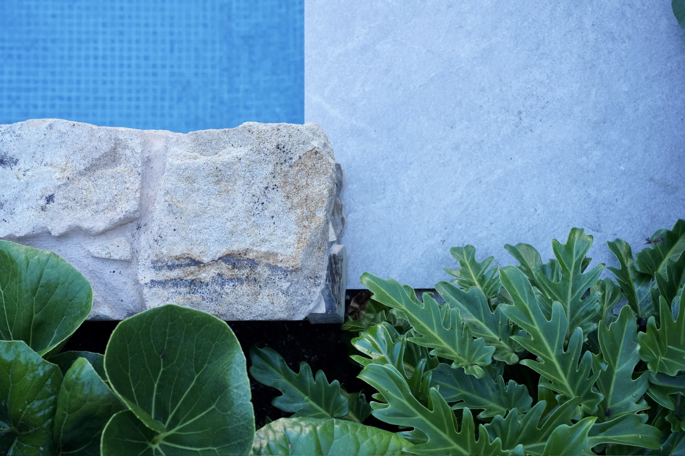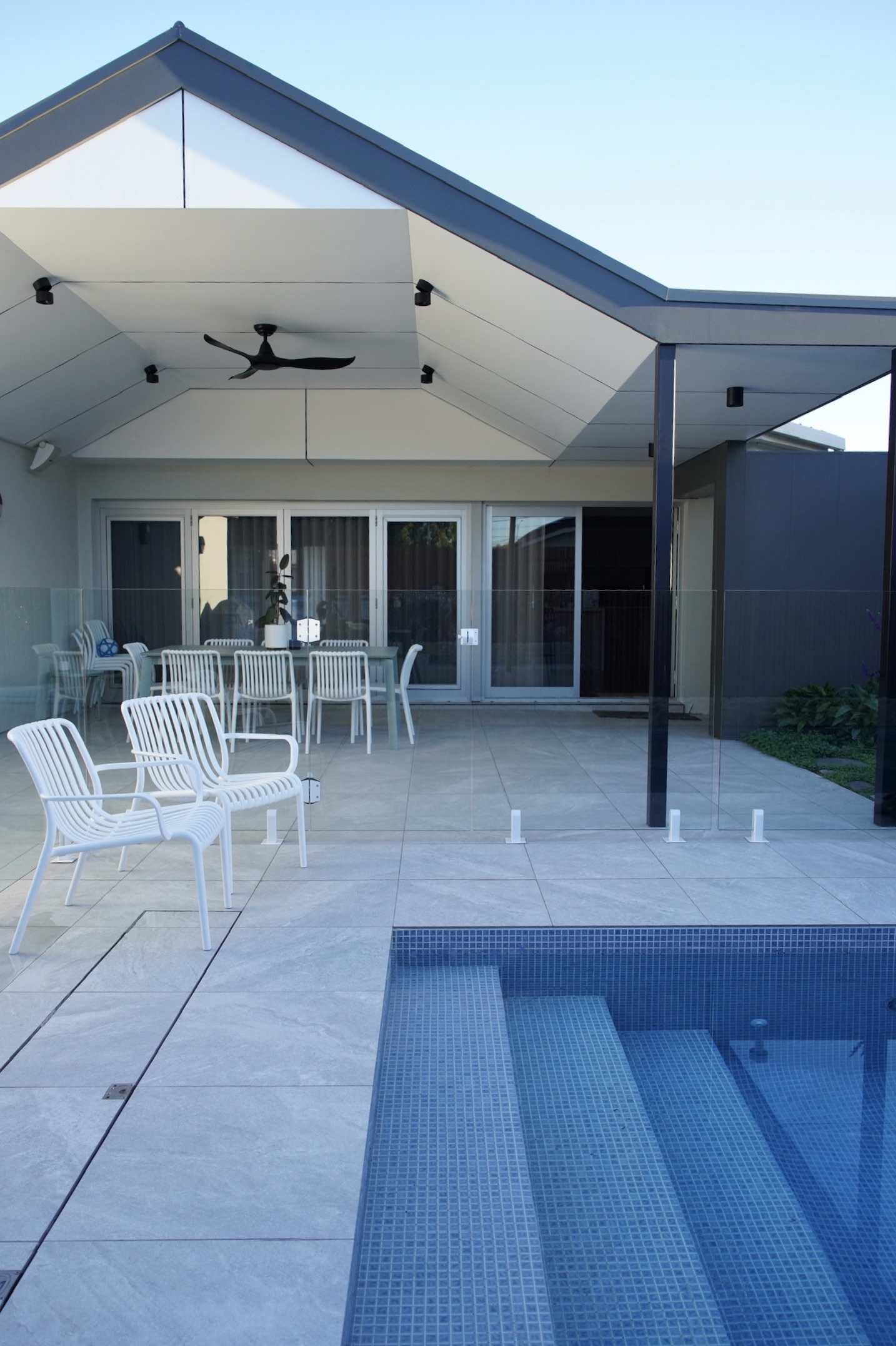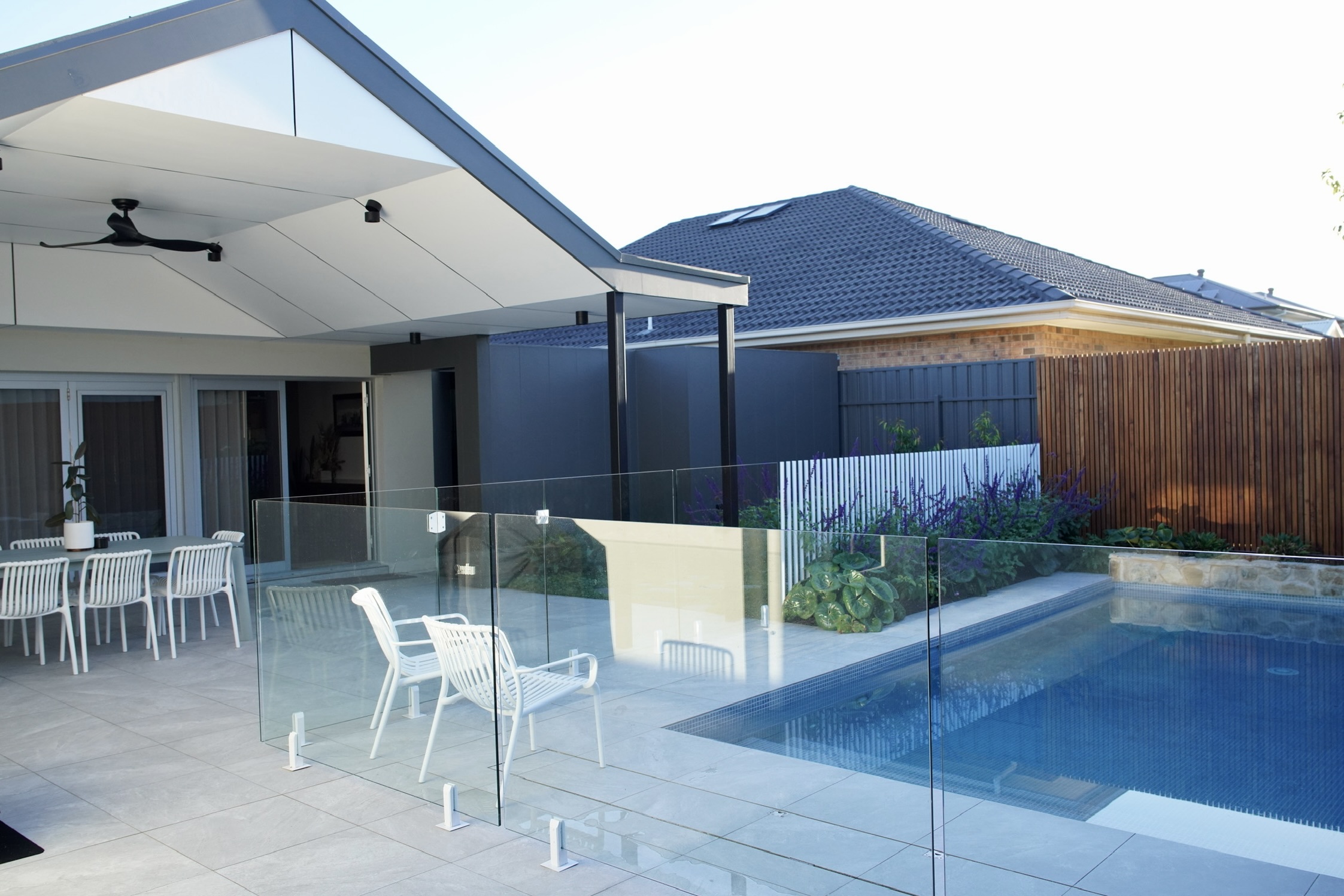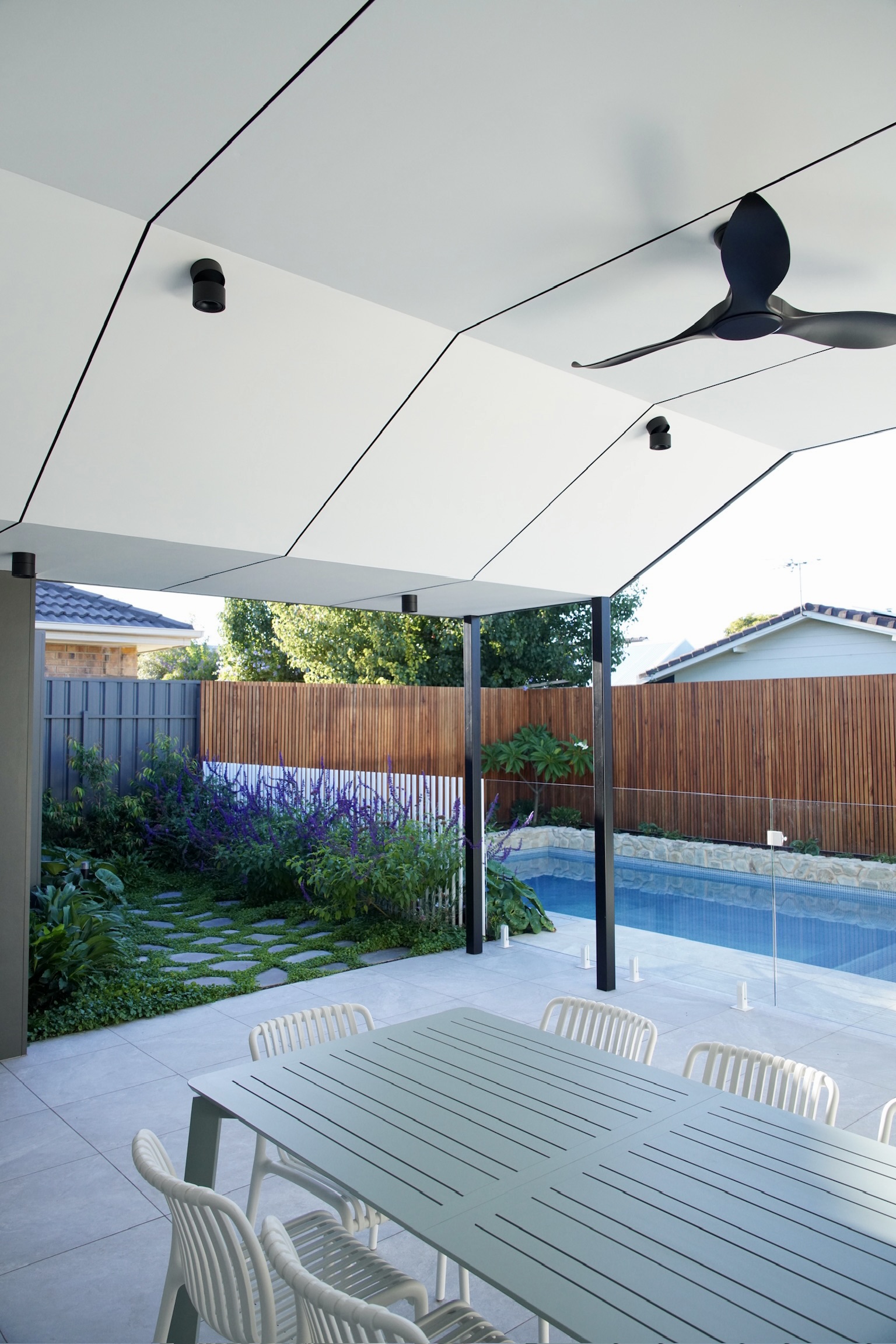 The response began with subtraction. The existing pergola and shed were removed entirely, allowing light to re-enter the interior and re-establishing a sense of openness across the site. A new cathedral-style pergola was introduced, carefully proportioned and elevated to draw in natural light while still providing shade and structure. The raised form allows sunlight to penetrate deep into the adjoining living spaces, creating a much softer, brighter internal environment throughout the day. At the centre of the garden sits a custom concrete swimming pool, designed as both a functional element and a visual anchor. The pool is framed by Basket Range sandstone, which forms a subtle retaining edge and introduces a grounded, natural materiality that contrasts with the clean architectural lines of the space.