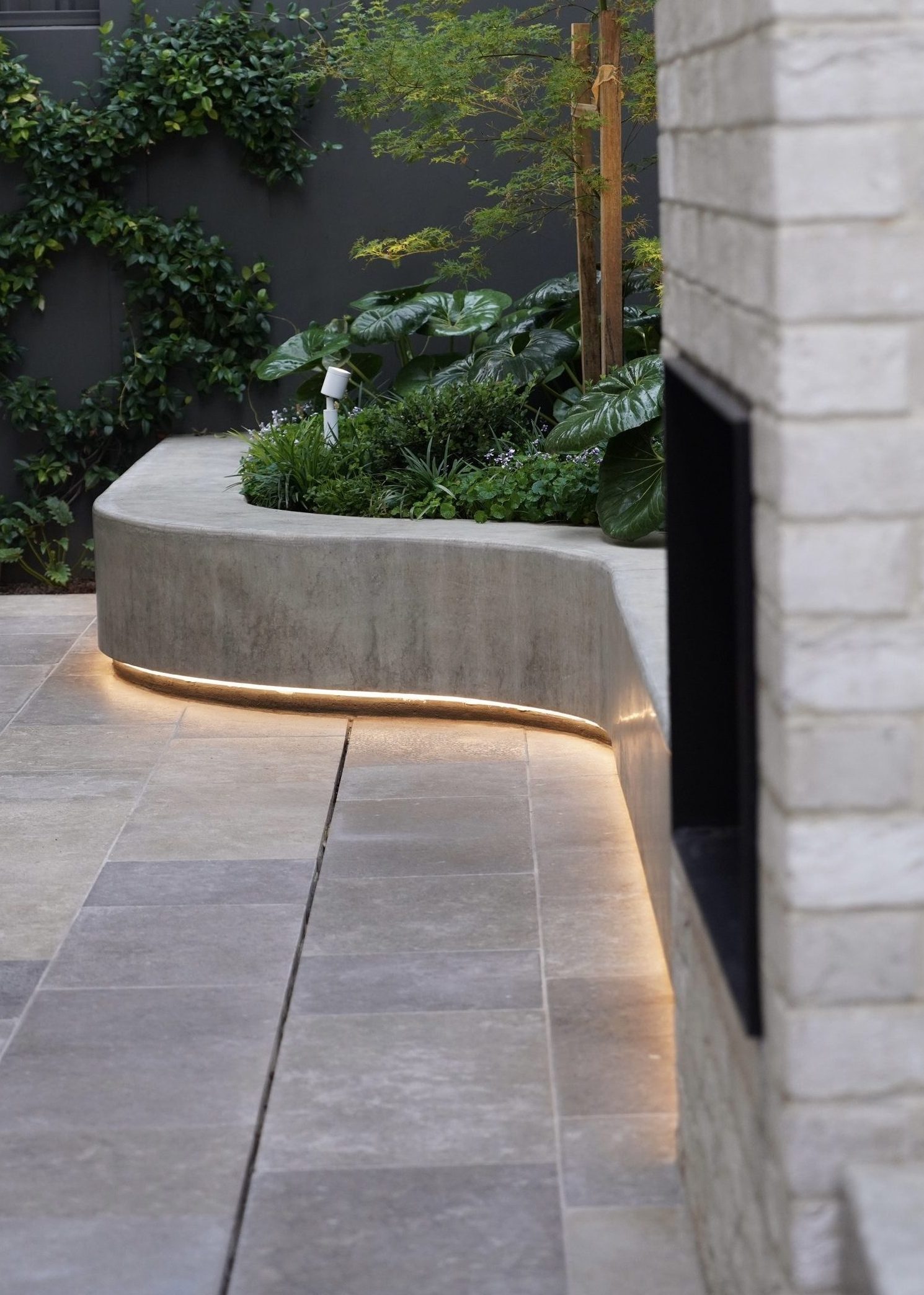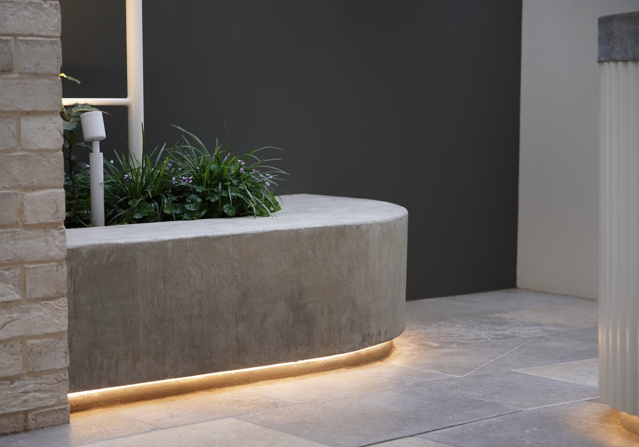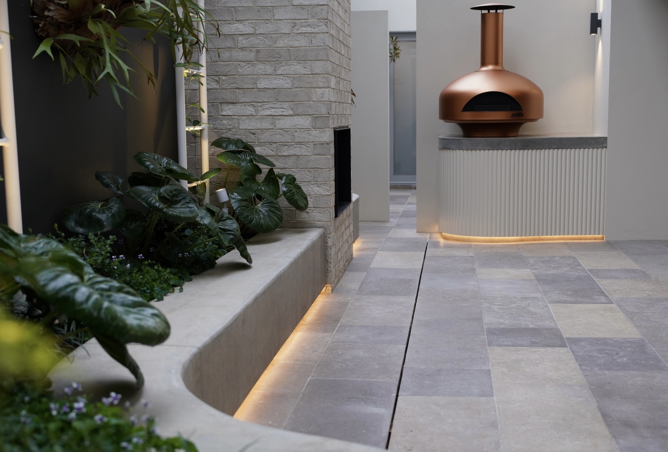 A continuous palette of tumbled limestone was used throughout to ground the space and bring a softer, more natural feel. At the centre of the garden, a newly designed and constructed chimney anchors the layout, with curved burnished concrete seating wrapping either side to create a place to sit, gather and connect. A custom steel fire grate has been integrated into the fireplace, reinforcing it as a key feature within the space. Under-seat lighting has been installed beneath the concrete seating, casting a soft glow across the limestone and creating a warm, relaxed atmosphere into the evening.