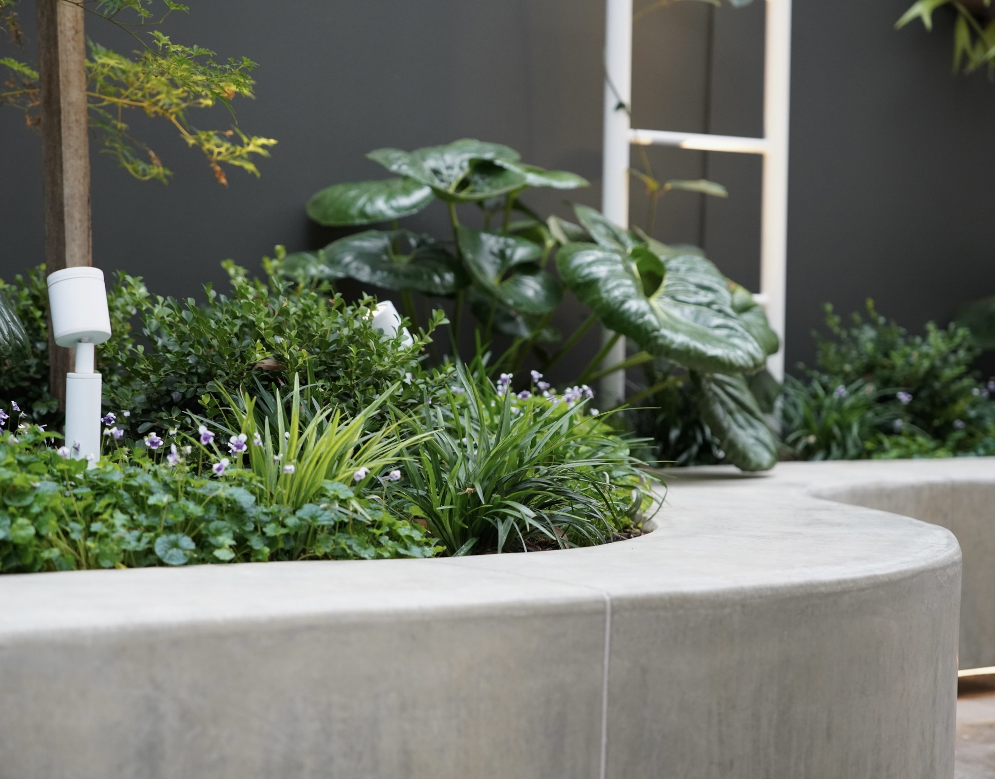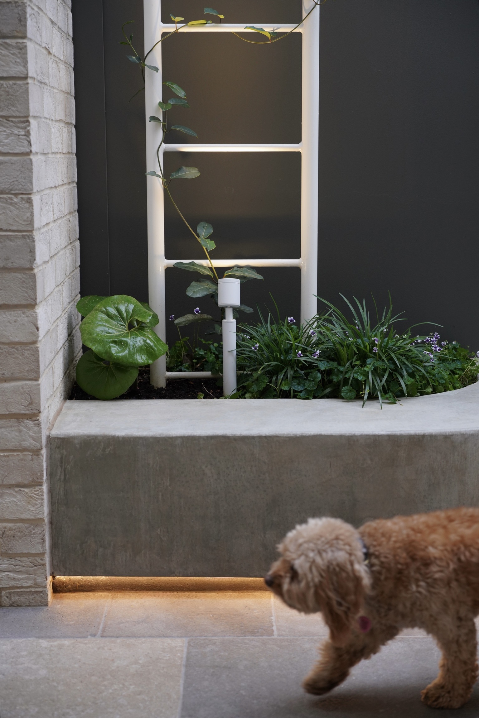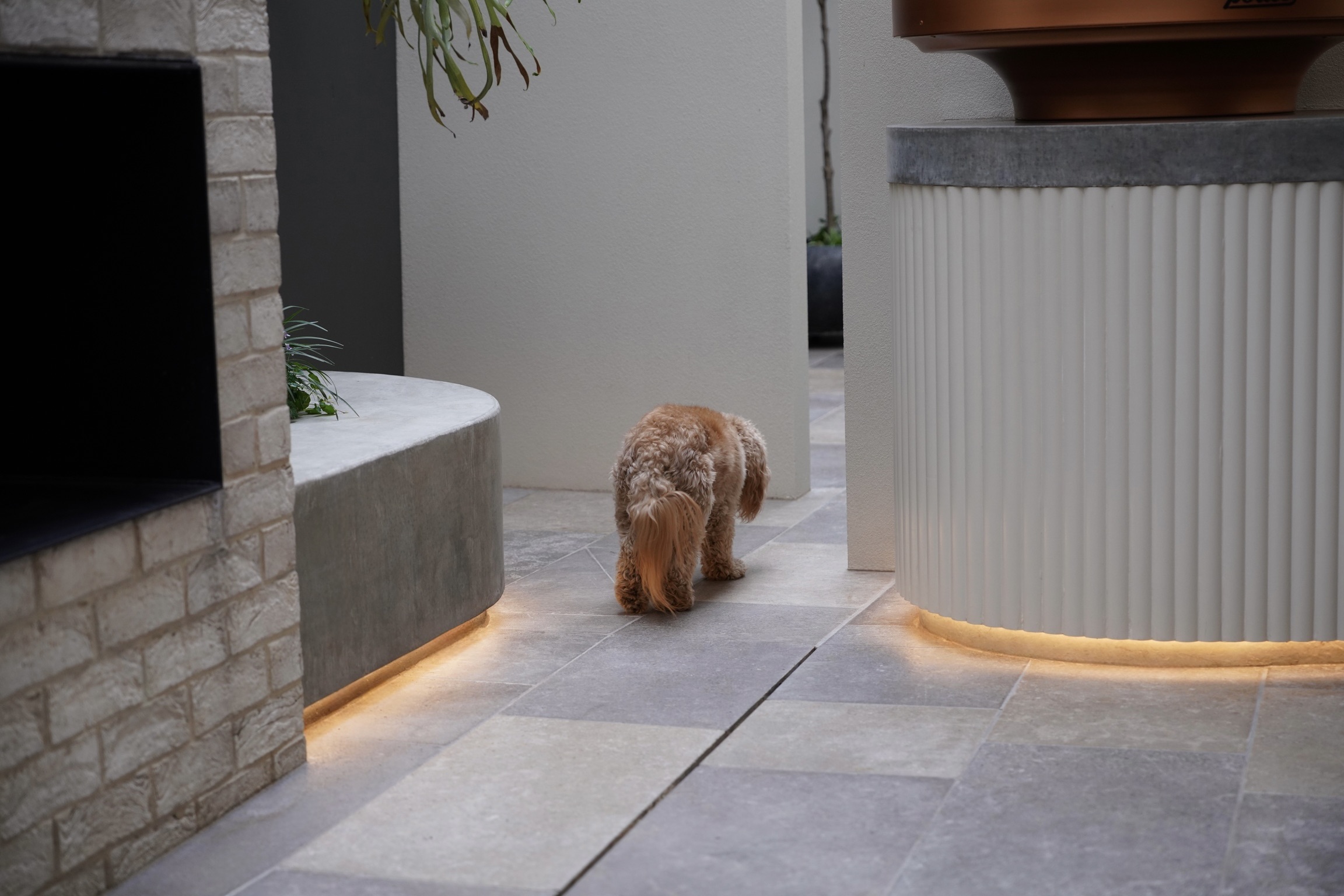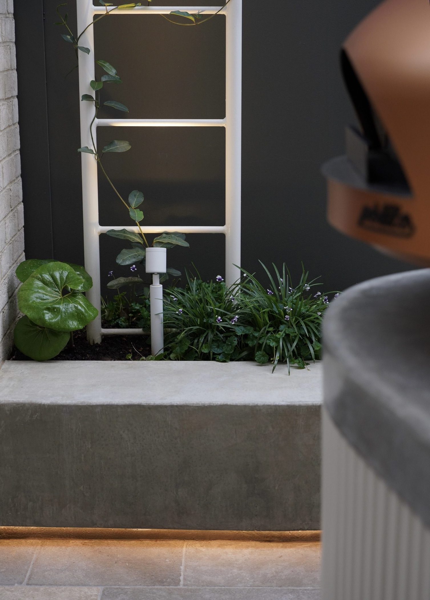 A continuous palette of tumbled limestone was used throughout to ground the space and bring a softer, more natural feel. At the centre of the garden, a newly designed and constructed chimney anchors the layout, with curved burnished concrete seating wrapping either side to create a place to sit, gather and connect. A custom steel fire grate has been integrated into the fireplace, reinforcing it as a key feature within the space. Under-seat lighting has been installed beneath the concrete seating, casting a soft glow across the limestone and creating a warm, relaxed atmosphere into the evening.