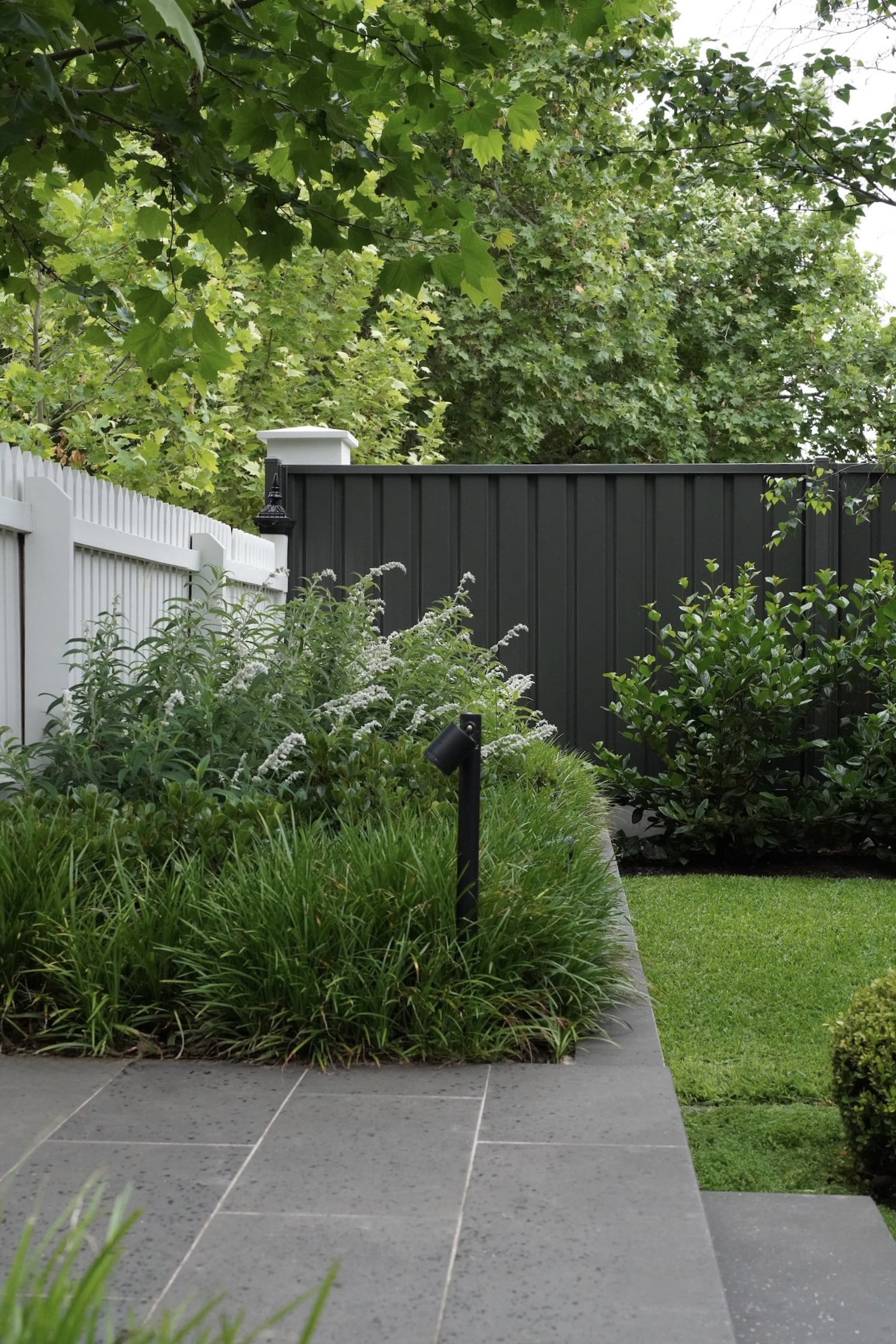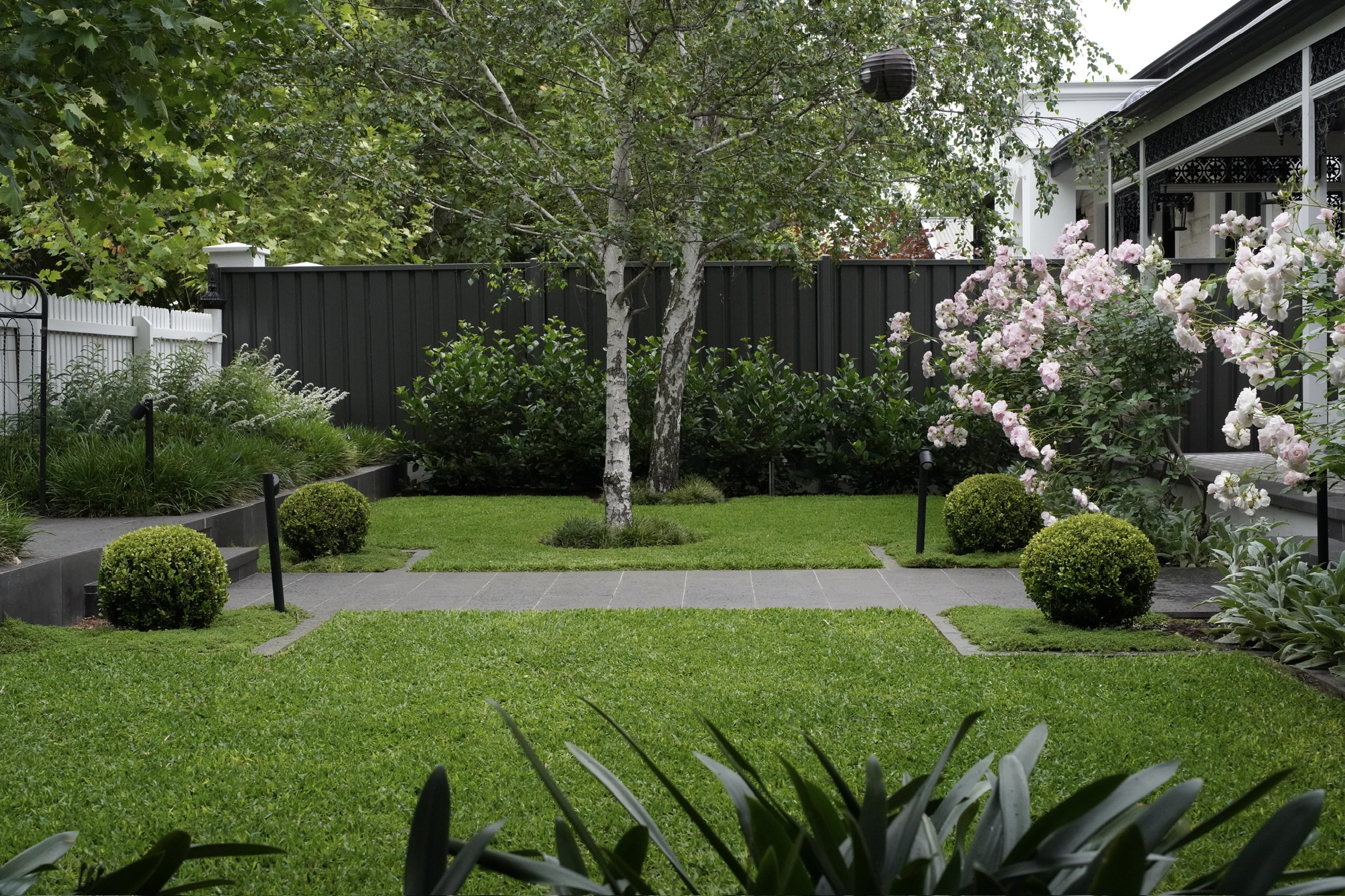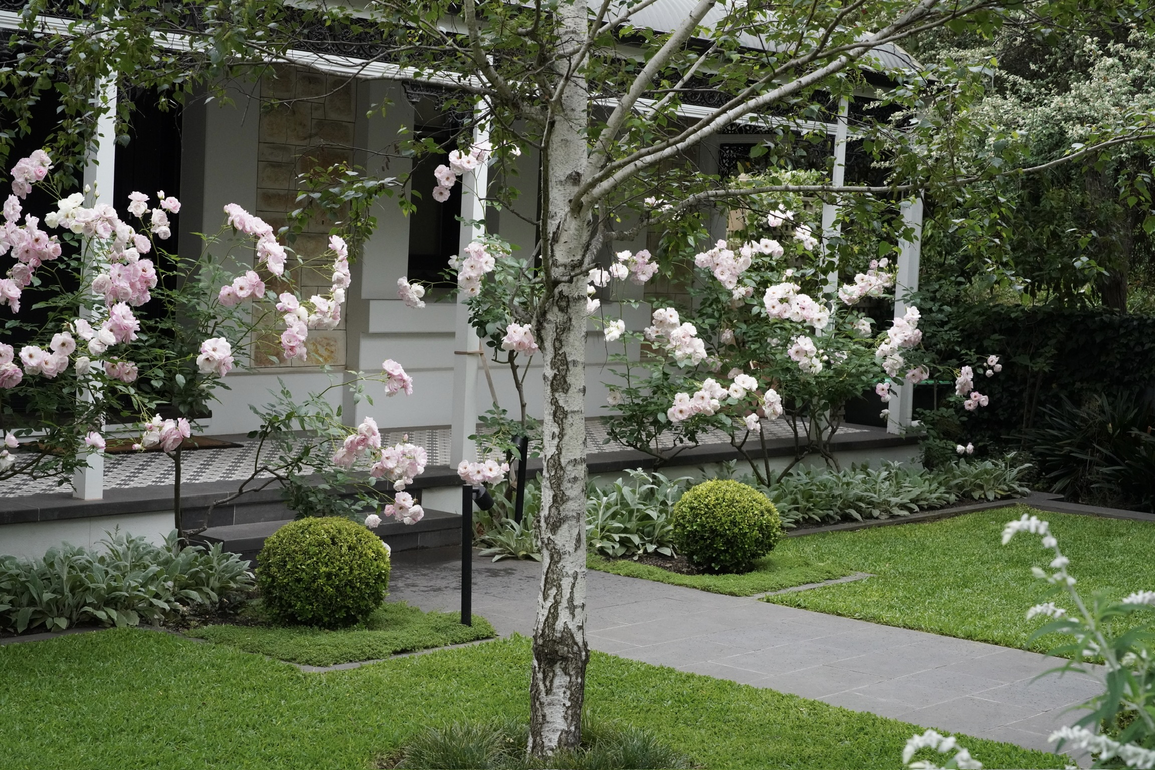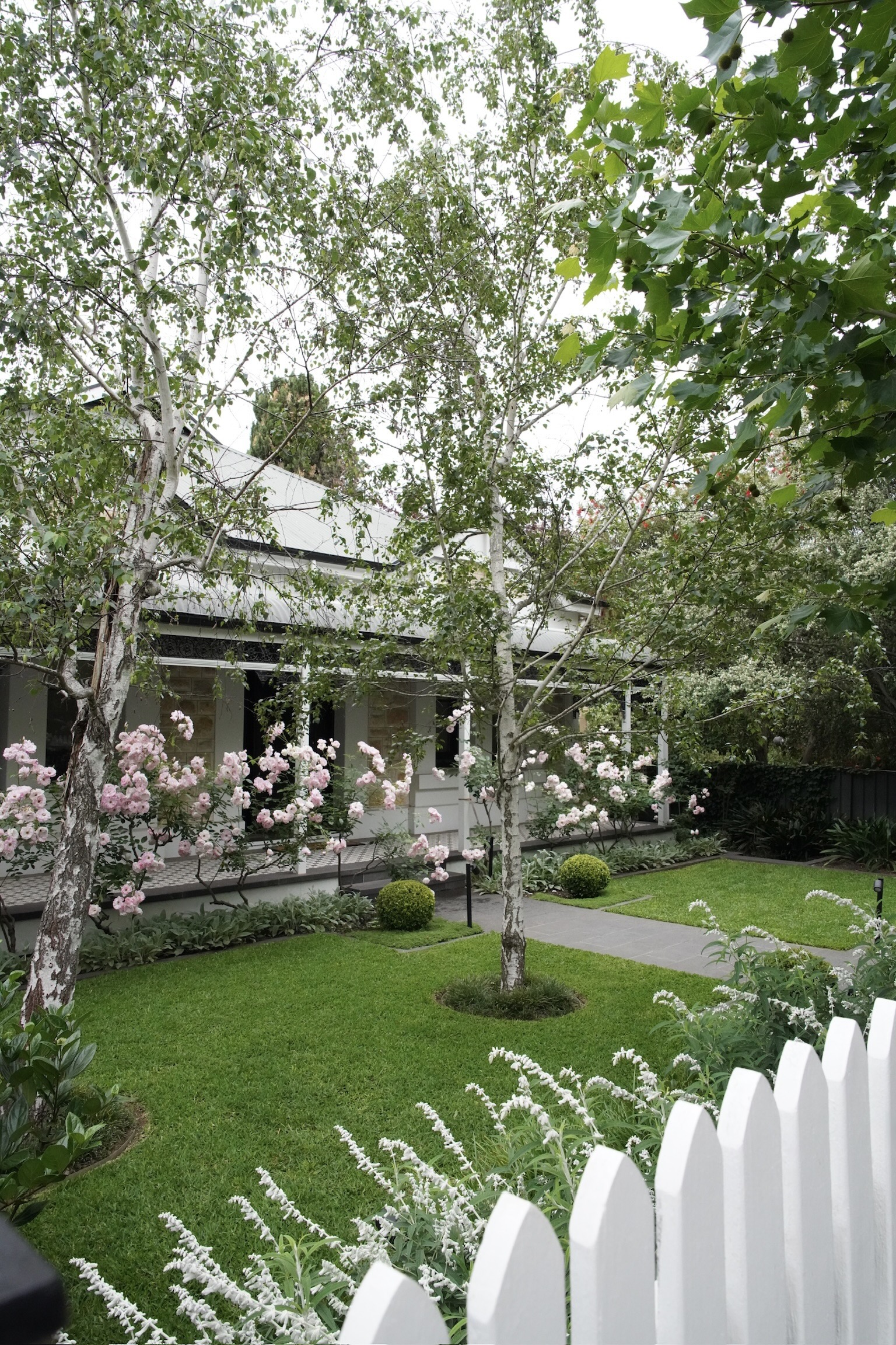 We retained the existing Betula pendulas, preserving their graceful structure and dappled shade. The verandah was retiled to compliment the natural tones of the garden, and a pedestrian path of natural bluestone guides visitors through the space, connecting entrances. A classic white picket fence frames the garden, adding charm and enclosure without feeling restrictive.