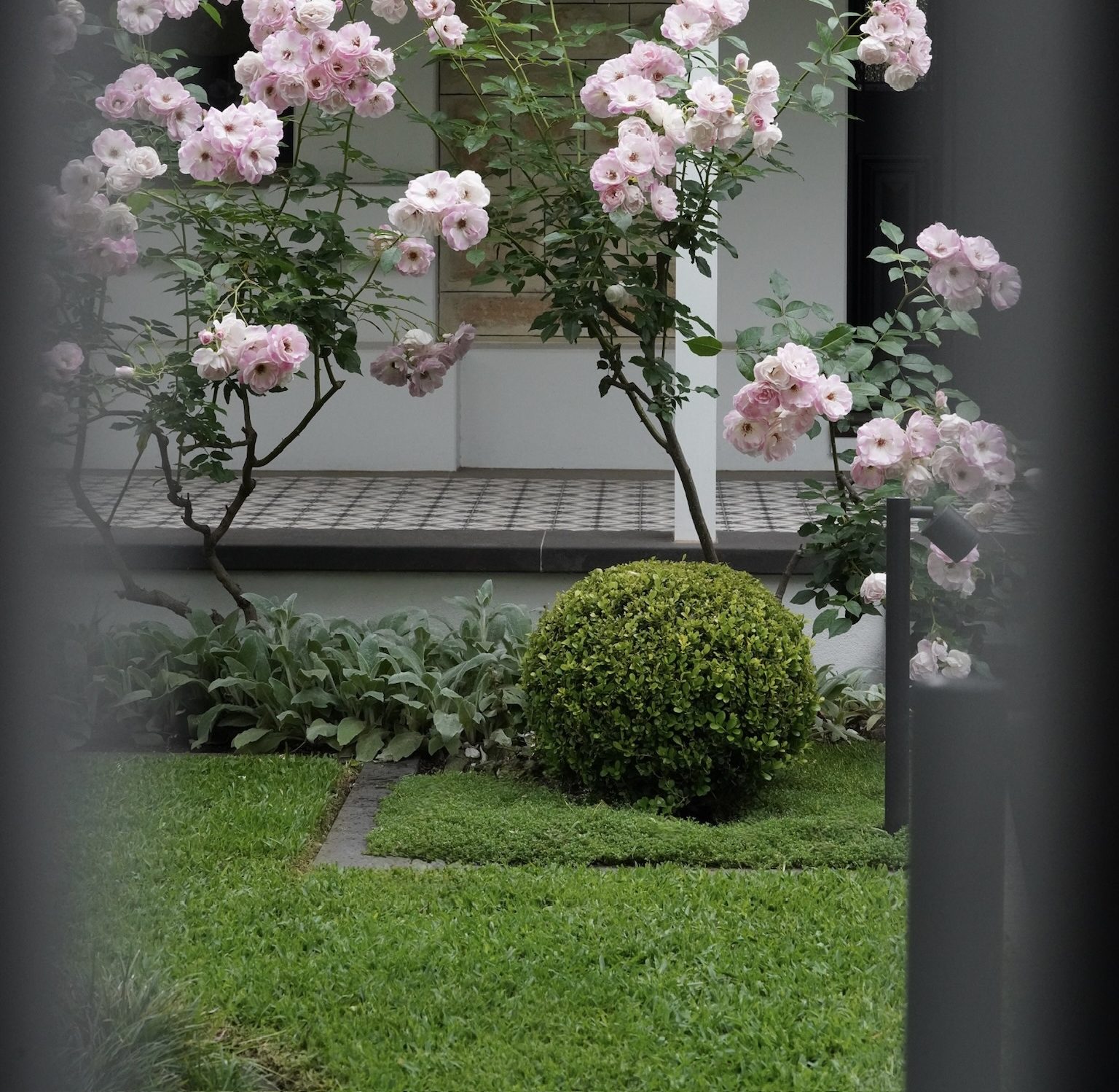 A lush lawn provides the family with a soft, usable area for relaxing and play, while structured Buxus spheres, seasonal perennials, and floribunda roses introduce layers of texture, color, and form throughout the year. Thoughtfully placed garden lighting enhances the atmosphere in the evening, highlighting feature plants and guiding movement through the space.
